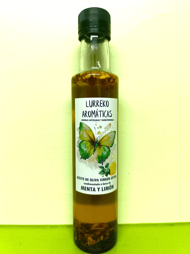 Aceite de cosecha propia, variedad autóctona redondilla, olivos centenarios a 700 m de altitud. Aceite de oliva VIRGEN EXTRA ECOLÓGICO condimentado a base de LIMÓN Y MENTA ECOLÓGICA de cultivo propio. Elaborado de manera artesanal, botella a botella, a mano en nuestro obrador. Producto de calidad premium.